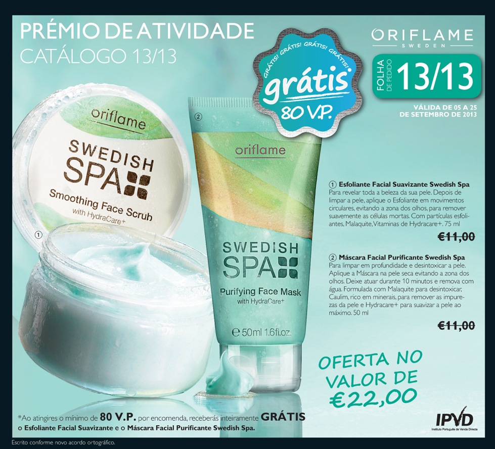 Neste Catálogo 13 da Oriflame, em vigor de 5/9 a 25/9 a Oferta são 2 produtos em vez de 1 num total de 22€.