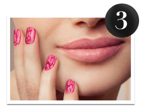 3º PASSO: LÁBIOS & UNHAS LÁBIOS: Delineia os teus lábios com o Delineador de Lábios 24606 Nougat. Aplica duas camadas de Batom Lipmania 21256 Flirty Pink. UNHAS: Aplica uma ou duas camadas de Verniz Base Graffiti 24602 Fuchsia e deixa secar. Aplica o Verniz Efeito Craquelê 24599 Pink e consegue um estilo único num estalar de dedos.